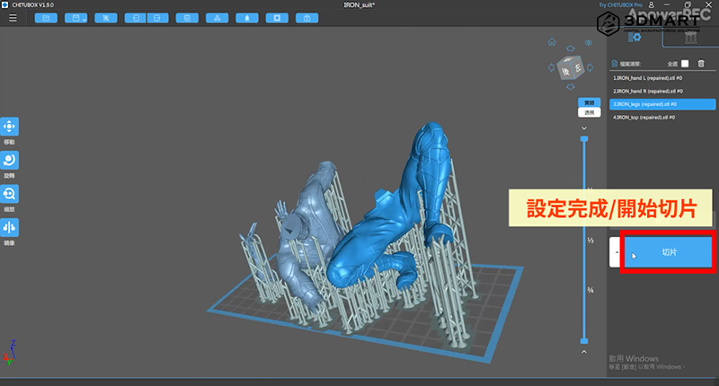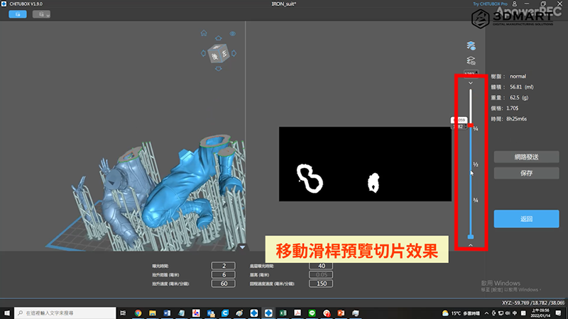最後點(diǎn)選「切片」即可獲得模型切片檔,軟體運(yùn)算後會(huì)顯示詳細(xì)內(nèi)容,包含材料樹脂類型、列印時(shí)間;將檔案存入U(xiǎn)SB後上傳至機(jī)器,在Phrozen Sonic Mini 8K內(nèi)讀取後開始列印。
