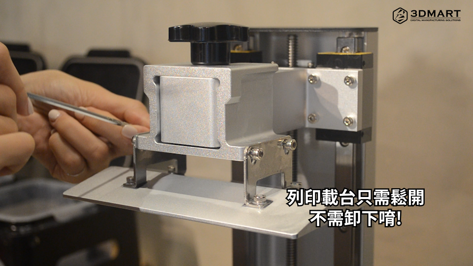 將樹脂槽卸下,並將列印載臺(tái)左右固定螺絲鬆開(載臺(tái)不需卸下)