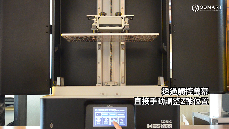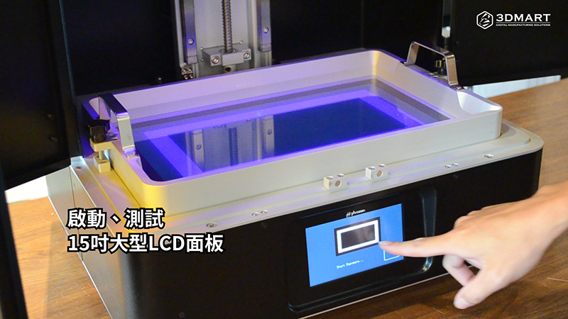 插上電源線、啟動(dòng)機(jī)器後,安裝列印載臺(tái)並鎖緊頂部螺絲,透過(guò)觸控螢?zāi)豢梢栽O(shè)定一次下降的距離,直接手動(dòng)調(diào)整z軸位置;啟動(dòng)、測(cè)試15吋大型LCD面板,最後再依照需求,將要使用的樹(shù)脂倒入樹(shù)脂槽,完成3D列印前置作業(yè)。