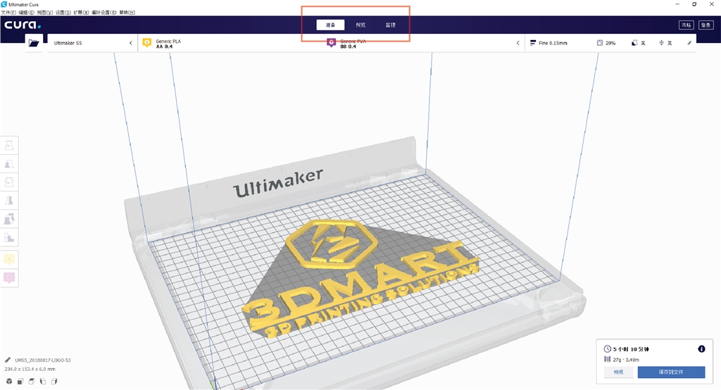 Ultimaker Cura中新的使用界面更加適應各類型用戶,舊版的控制區(qū)改為顯示在上方;在「準備」區(qū)塊可以看到3D模型外觀,模擬3D列印過程的「分層視圖」及「預覽視圖」則移至「預覽」區(qū)塊,「監(jiān)視」區(qū)則可以監(jiān)控Ultimaker列印機的列印進度。