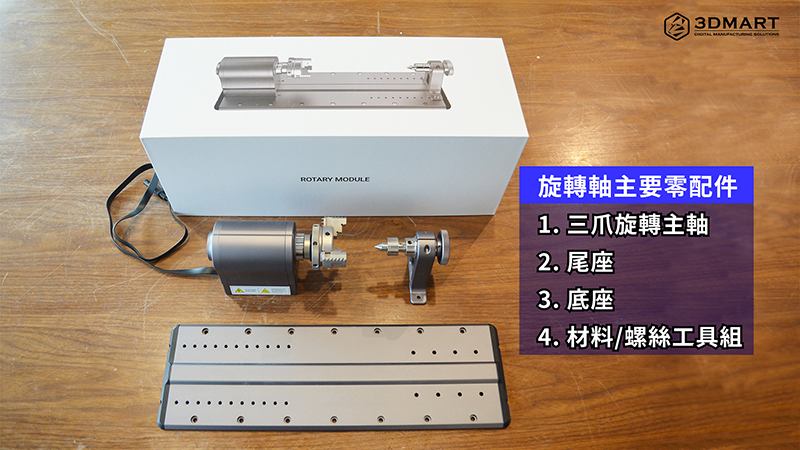 Snapmaker 2.0旋轉(zhuǎn)軸開(kāi)箱有「三爪旋轉(zhuǎn)主軸」、「尾座」、「底座」三個(gè)主要零配件,另外有三組測(cè)試材料(用於雷射雕刻、CNC銑床雕刻)、螺絲工具組;只需簡(jiǎn)單鎖緊螺絲,就能將旋轉(zhuǎn)主軸、尾座固定於底座上,再安裝在CNC工作平臺(tái)上,即可完成組裝!