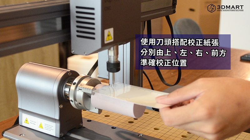 校正主要是透過(guò)刀頭、校正紙張(內(nèi)附),分別由材料上、左、右、前四個(gè)方向,進(jìn)行準(zhǔn)確位置校正,點(diǎn)選螢?zāi)簧系募^按鈕,即可即時(shí)控制刀頭方向;完成校正後,安裝旋轉(zhuǎn)軸尾座,設(shè)備前置作業(yè)就完成了!