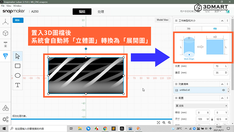 3D圖檔置入軟體後,系統(tǒng)會(huì)自動(dòng)將「3D立體」轉(zhuǎn)換為「平面展開(kāi)圖」,再將展開(kāi)圖與材料預(yù)覽區(qū)對(duì)齊。