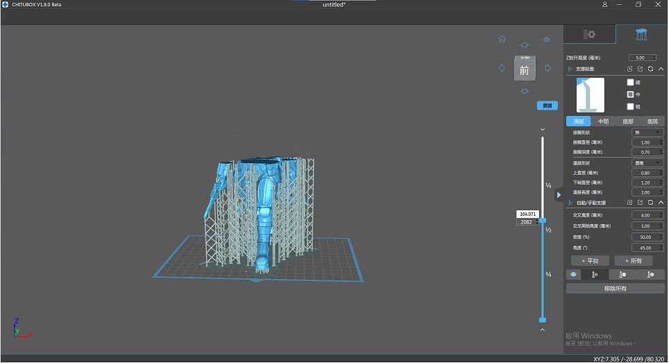 5. 數(shù)據(jù)設(shè)定完成後,拖拉右方滑軌可以檢視、模擬實(shí)際成型過程,在開始3D列印前檢查模型的每個(gè)懸空處,是否都有完整建立到支撐。