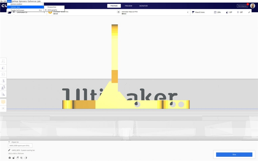 作為專業(yè)用戶,在準(zhǔn)備列印時需要對3D視圖類型進(jìn)行更多控制,Cura 4.2引入了正視圖功能 - 與專業(yè)CAD軟體使用的視圖類型相同,因此您可以輕鬆地將模型的尺寸與CAD設(shè)計進(jìn)行比較。 在「檢視>相機檢視>正視圖」中找到這個選項(實際名稱與位置將以Cura 4.2正式版為主)。