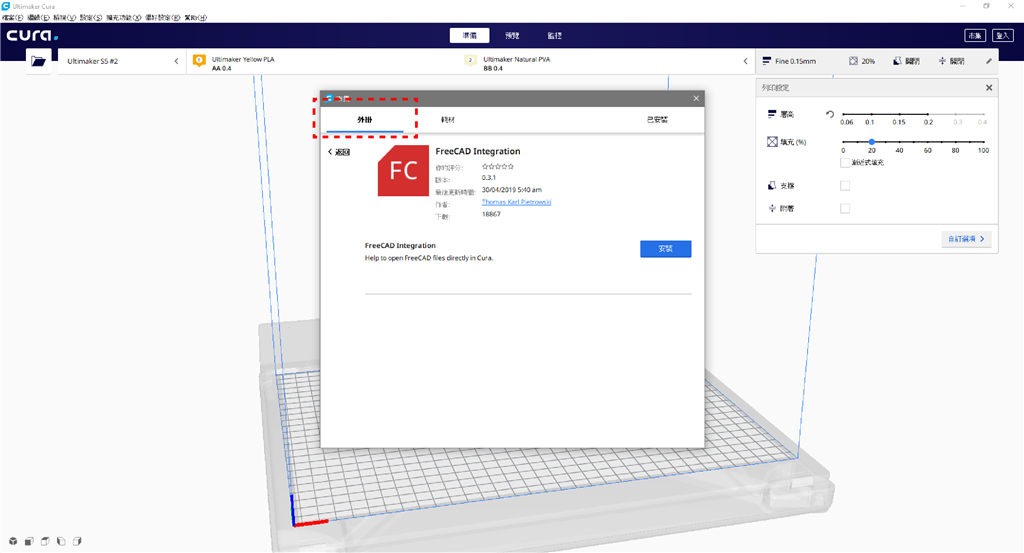 (點(diǎn)選Ultimaker 「市集」中的「外掛」選單,點(diǎn)選安裝就能下載想要的外掛功能。)
