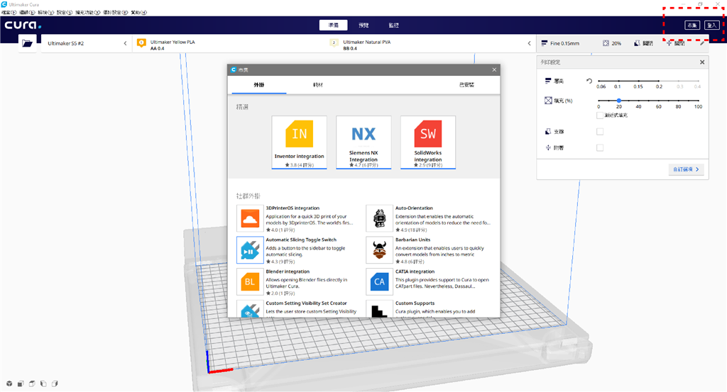 各式軟體外掛能依需求提供個(gè)人化調(diào)整,例如:有些外掛能銜接CAD和Ultimaker Cura,方便工程師、設(shè)計(jì)師直接將3D圖檔進(jìn)行列印切片、讓步驟更簡(jiǎn)單。Ultimaker也貼心的意識(shí)到,下載及安裝是初學(xué)者常見(jiàn)的入門(mén)障礙,因此新版的Cura中已經(jīng)整合這些功能,打開(kāi)Cura後就能在介面的右上角找到。