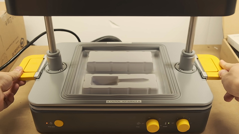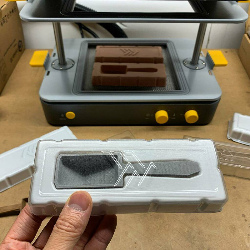 ,下壓機器3秒抽真空,即可快速測試包裝造型,完成後能輕鬆脫模的特性,不會對吸塑物件表面造成損壞。