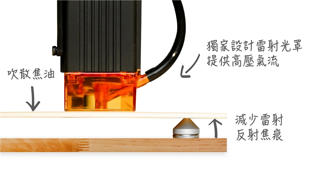 FLUX Lazervida 吹氣套件 Lazervida吹氣套件獨家設(shè)計雷射光罩,優(yōu)化空氣流道,增強吹氣風(fēng)量,有效吹散正面粉塵與煙霧。墊高圓錐有效協(xié)助避免雷射時材料背面產(chǎn)生的反射焦痕。雙重搭配提供更精緻雷雕雷切作品。