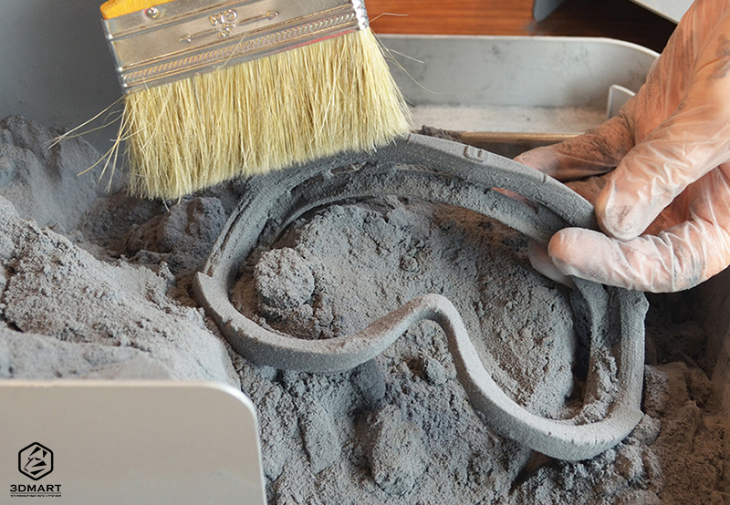 SLS技術使用粉末聚合物作為3D列印的原料,將粉末倒入機器中,機器內(nèi)部會將薄層粉末來回鋪平在列印範圍,再以雷射光融合材料,並透過微幅的高度升降堆疊並完成印品。由於粉末列印材料會填滿整個內(nèi)部空間,因此不須使用支撐結構輔助成型(因為整體在列印完成前是緊密的粉末,因此不會有中空材料掉落的問題),未使用完的粉末可以透過專用設備過篩後再與新的粉末混合使用。?