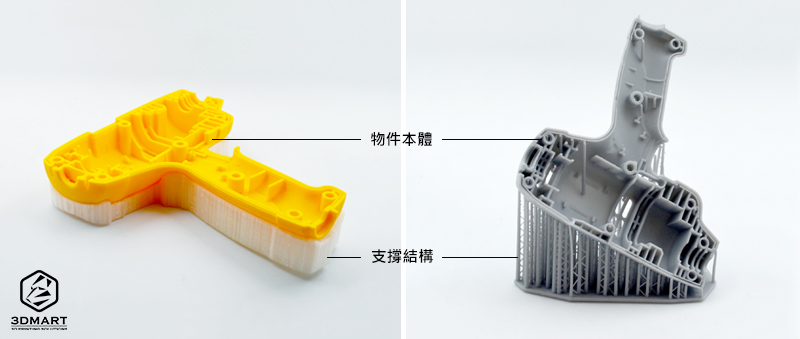3D列印技術的成形方式需考慮地心引力的影響,想像一下物體在懸空的狀態(tài)會往下掉,因此3D列印的材料在成型時若遇到懸空的結構,會需要額外建立輔助材料來生成懸空的主體以避免成型時材料往下掉。這種結構通常稱為支撐材料,根據(jù)不同列印形式,使用方式和材料也各有不同。其中,SLS(雷射粉末燒結)技術通常無需這種支撐結構,這會在下方進行說明。